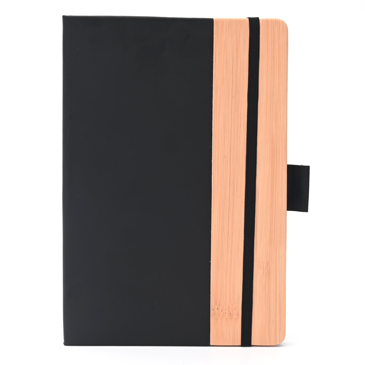 Cuaderno A5 de 80 hojas lisas de 70gr con tapa dura negra, con detalles símil madera.