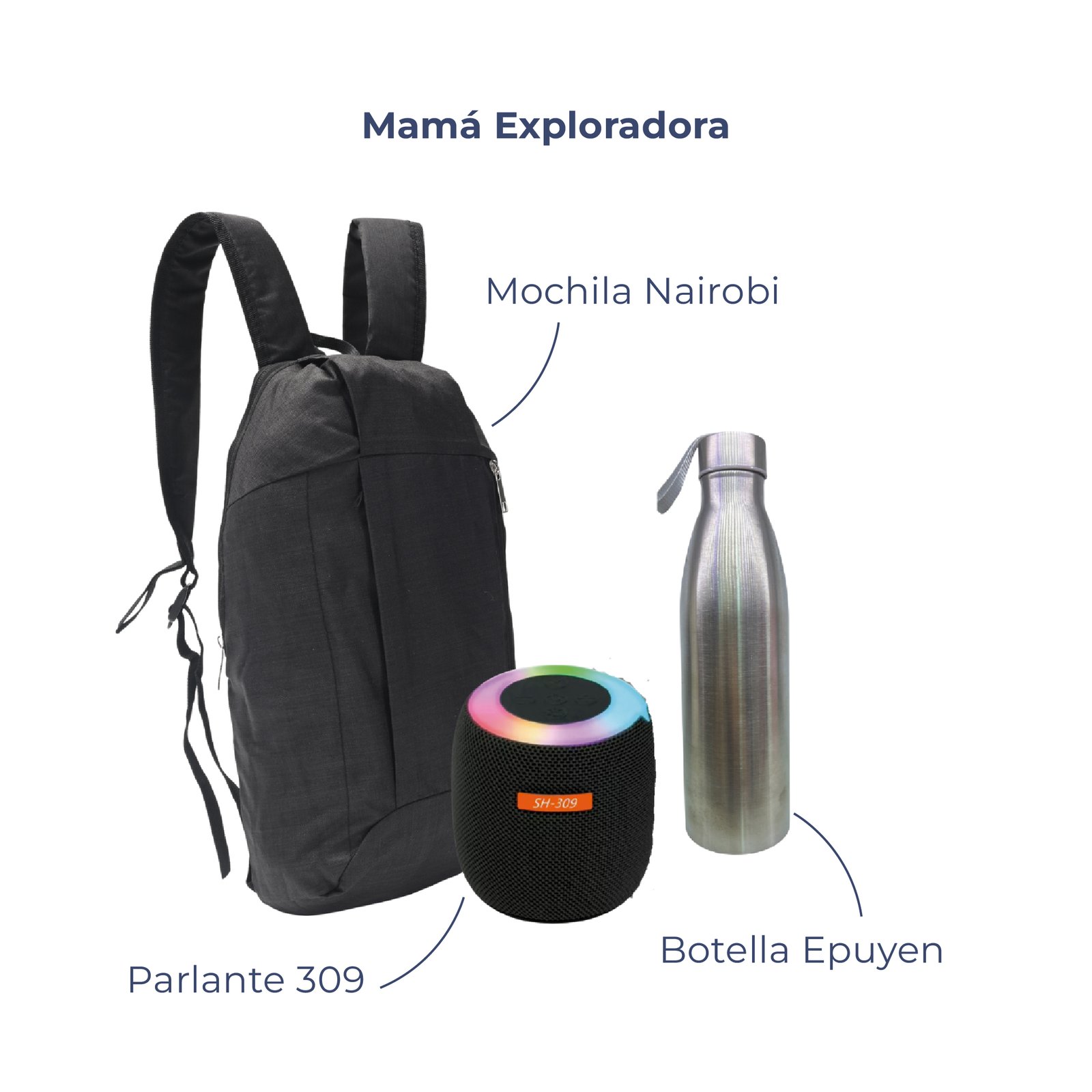 - Mamá Exploradora: Parlante 309 – Mochila Nairobi – Botella Epuyen