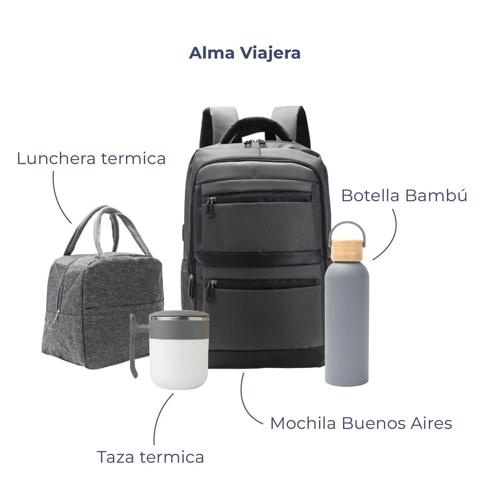 - Alma Viajera: Mochila Buenos Aires – Botella Bambú – Taza termica – Lunchera térmica