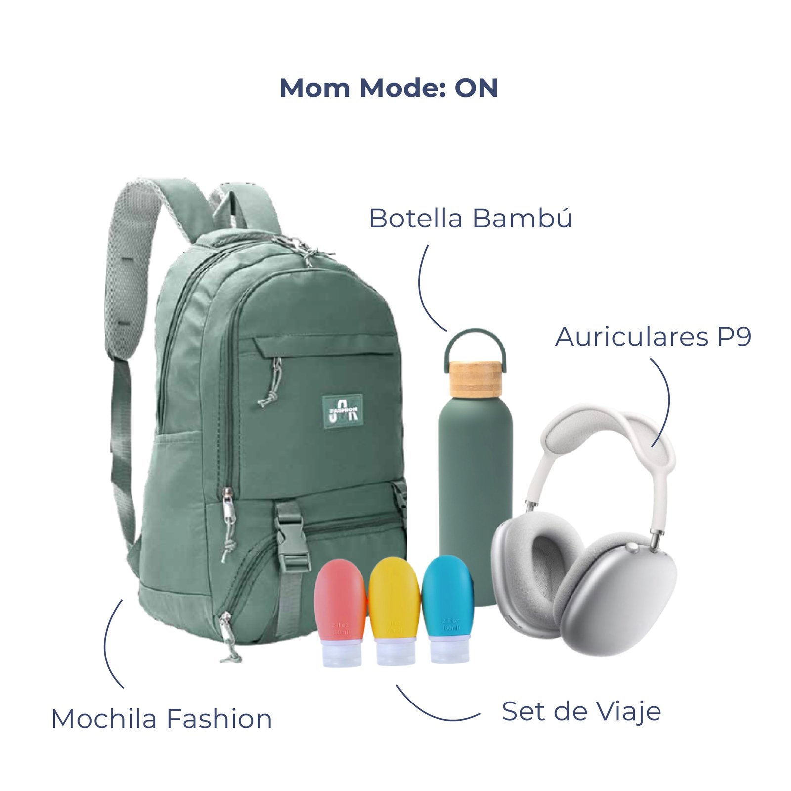 - Mom Mode:ON: Auriculares P9 – Set de Viaje – Botella Bambú – Mochila Fashion