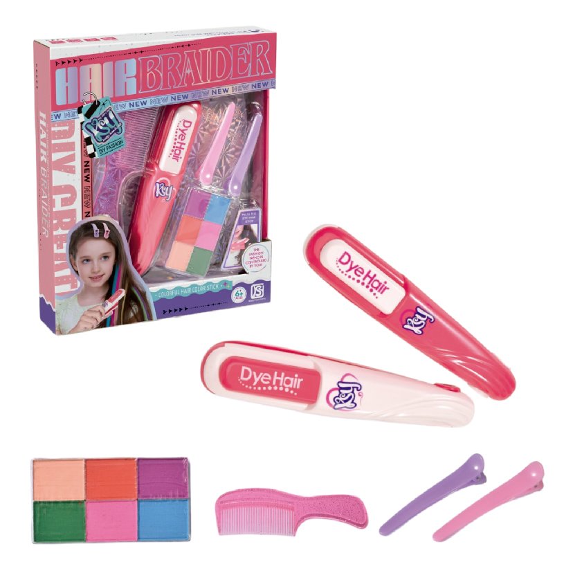 Set de peluquería, con tintes para el pelo. Permiten agregar tonos alegres y diversos accesorios brindan infinitas posibilidades para crear peinados únicos. Fácil de usar en 3 pasos: carga el color, presiona y sujeta. Tonos brillantes y seguros para el cabello.